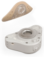 3) Een beengeleidingssysteem op een kleefbare patch wordt op de haarloze zone achter het oor gekleefd. Deze patch blijft gemiddeld één week zitten en geeft een comfortabel gevoel, omdat hij niet op de schedel drukt.