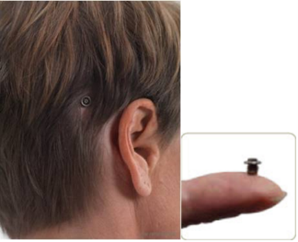 4) Het implantaat bevindt zich volledig onderhuids en de geluidsprocessor plakt magnetisch aan de buitenkant op het implantaat vast. Hierbij moeten de trillingen eerst door de huid heen voordat ze door het schedelbot naar het binnenoor worden geleid. Doordat de huid trillingen absorbeert, verliest het geluid wat aan sterkte.
